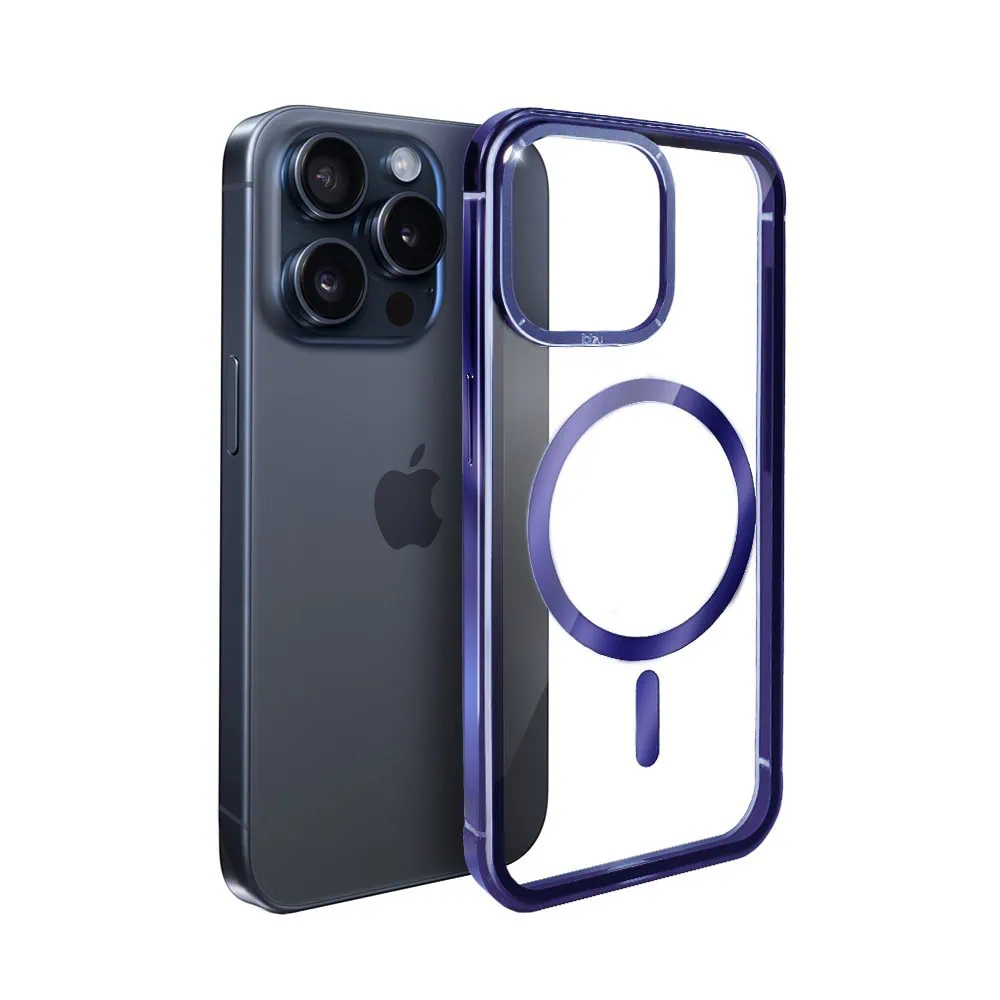 Etui do iPhone 15 Pro, Ibizu Elite Skin Cam Ring, krystalicznie czyste z metalową ramką, granatowe z Magsafe