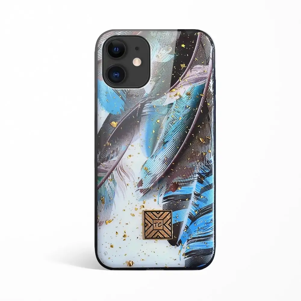 Etui do iPhone 12 brokatowe zielone pióra z cząstkami złota