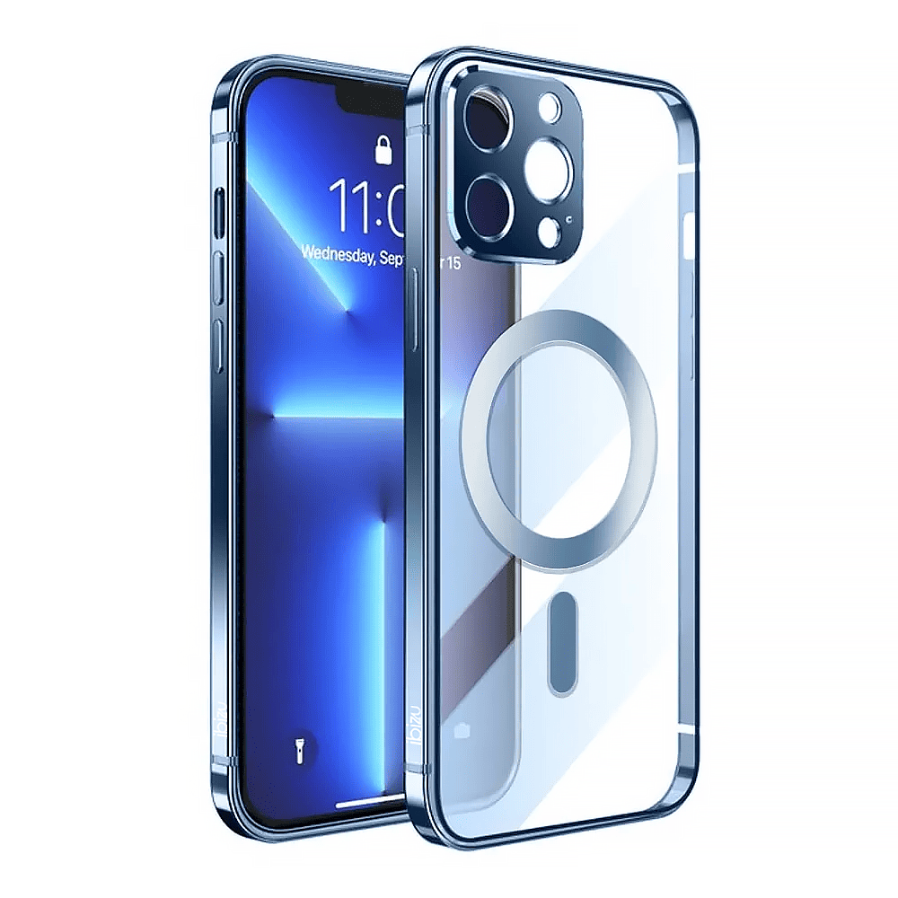 Etui do iPhone 13 Pro Max Ibizu Elite Skin, krystalicznie czyste z metalową ramką, górski błękit z MagSafe