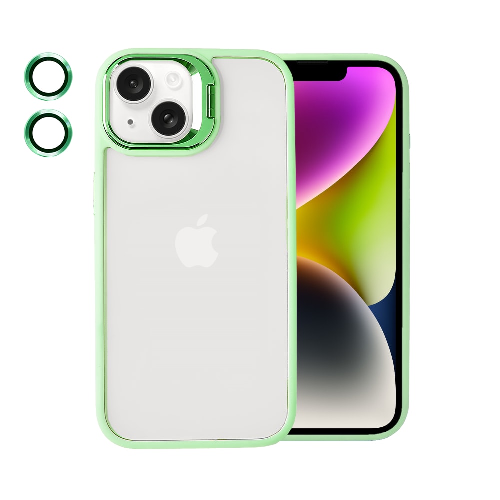 Etui do iPhone 14 cienkie przeźroczyste, 3w1 z podstawką i osłoną aparatu, miętowe