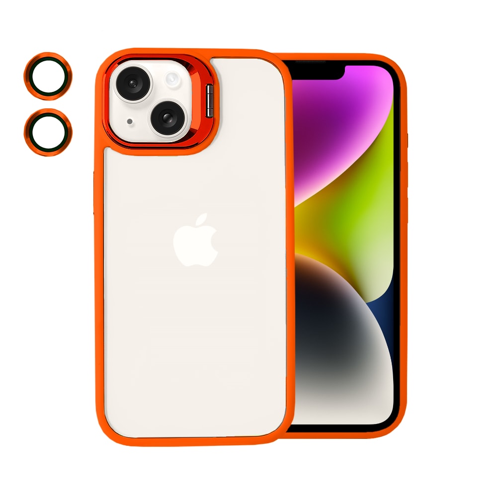Etui do iPhone 14 cienkie przeźroczyste, 3w1 z podstawką i osłoną aparatu, pomarańczowe