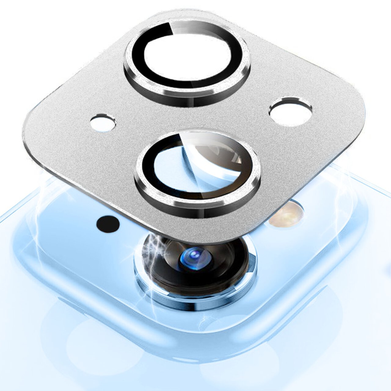 iPhone 14 pełne szkło hartowane na cały aparat z metalowymi pierścieniami, srebrne
