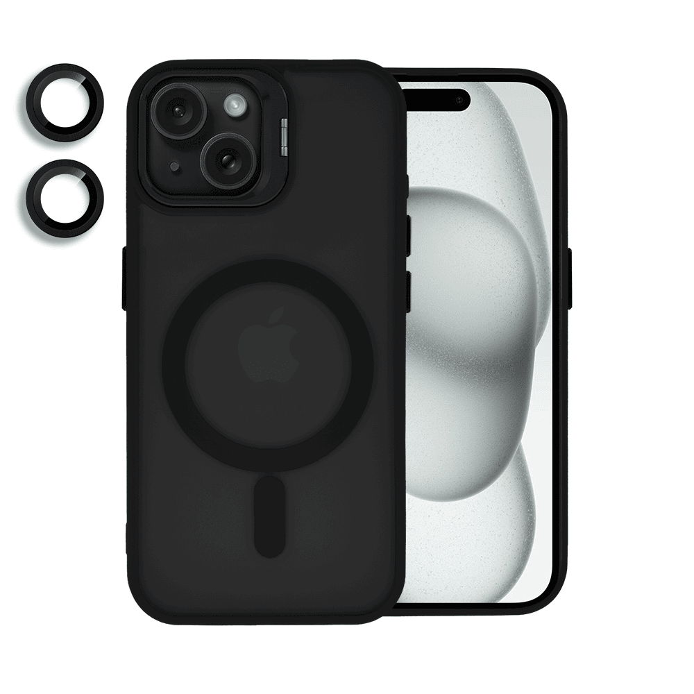 Etui do iPhone 15 Plus Arctic Stand, półprzeźroczyste, z osłoną aparatu i podstawką, czarne