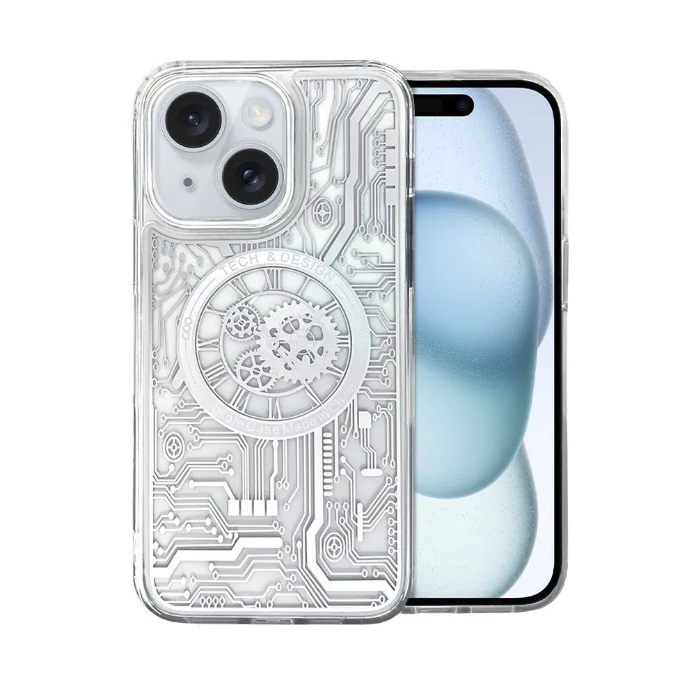Etui do iPhone 15 Plus ClockWork MagSafe, przeźroczyste z mechanizmem w środku, srebrne