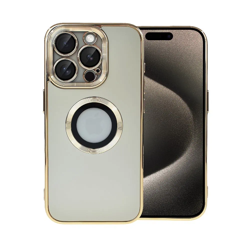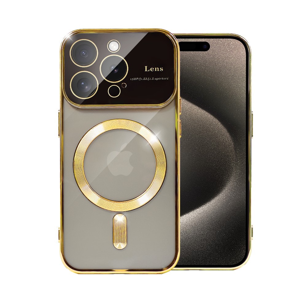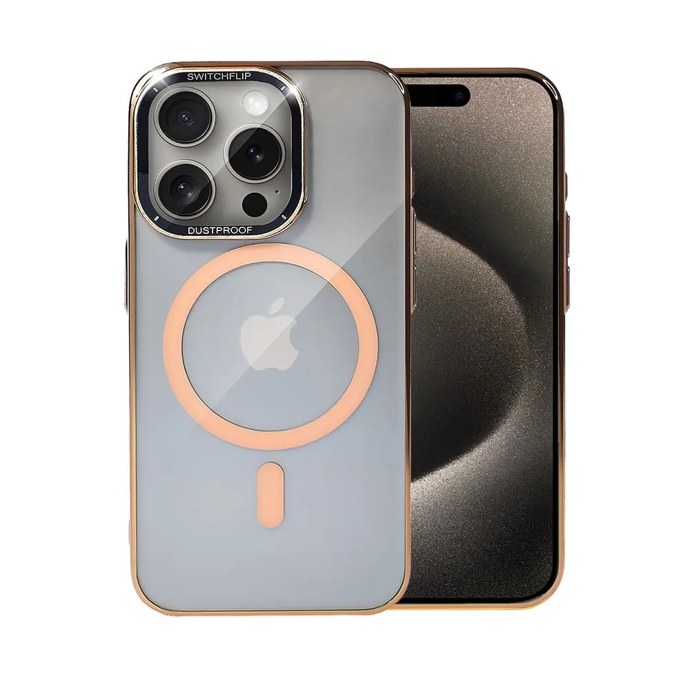 Obudowa do iPhone 15 Pro Max podwójna szyba i aluminium 360° przód + tył magnetyczna, matowy tył, z MagSafe i osłoną aparatu, złota