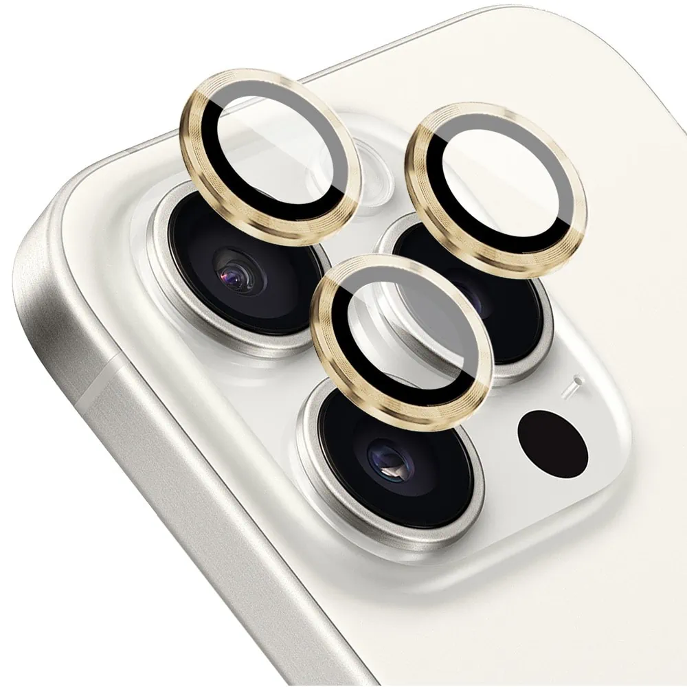 iPhone 15 Pro pełne szkło hartowane na cały aparat z metalowymi pierścieniami, złote