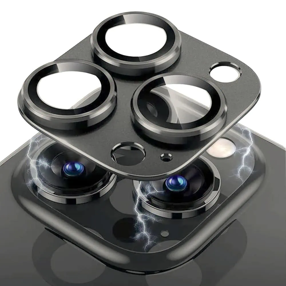 iPhone 15 Pro pełne szkło hartowane na cały aparat z metalowymi pierścieniami, czarne