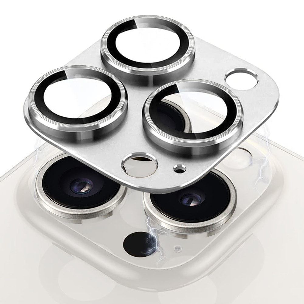 iPhone 15 Pro pełne szkło hartowane na cały aparat z metalowymi pierścieniami, srebrne