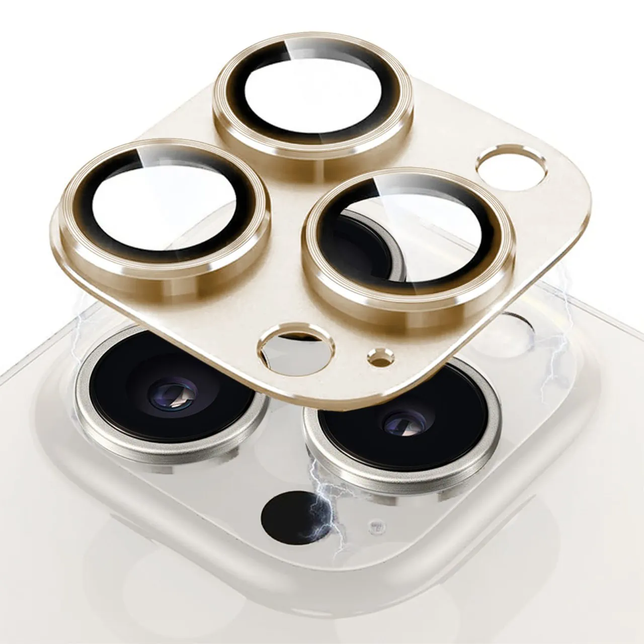 iPhone 15 Pro gładka metalowa osłona na cały aparat, wbudowane szkła 9H, złota