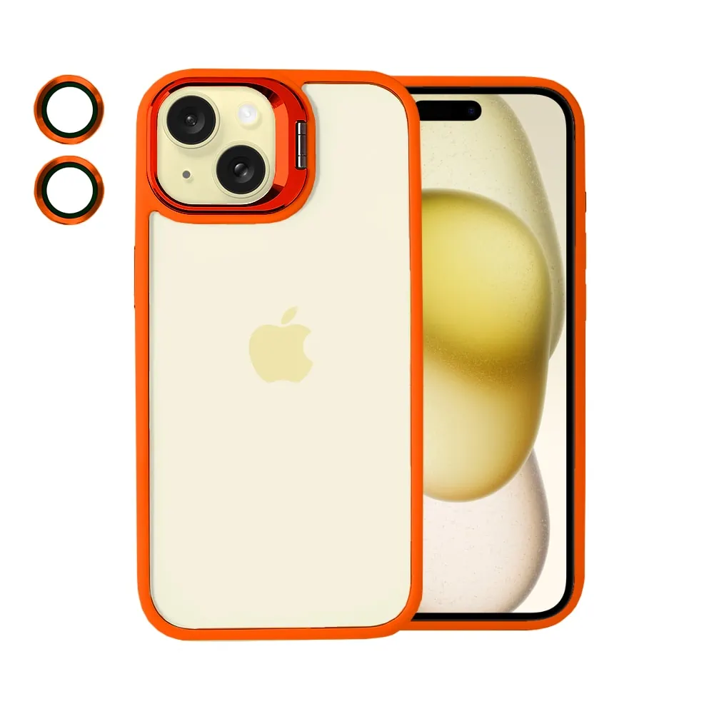 Etui do iPhone 15 cienkie przeźroczyste, 3w1 z podstawką i osłoną aparatu, pomarańczowe