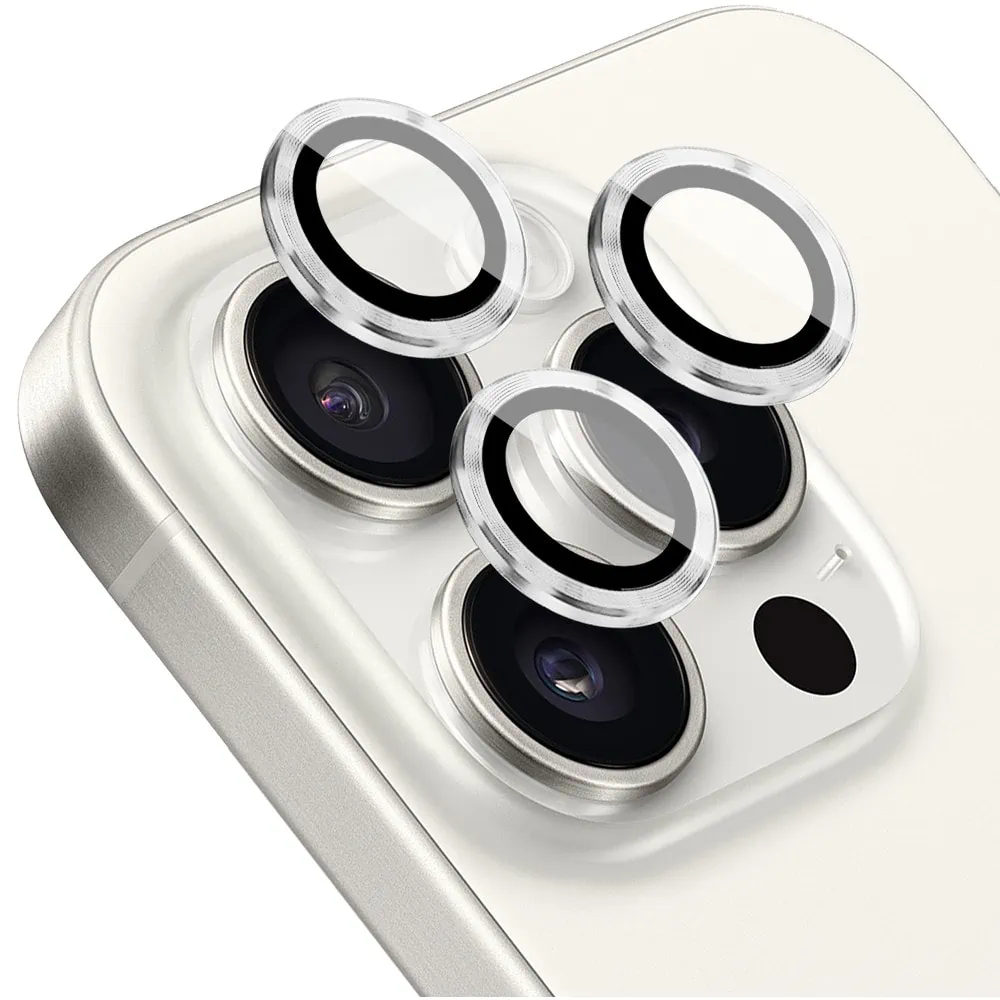 iPhone 16 Pro pełne szkło hartowane na cały aparat z metalowymi pierścieniami, srebrne