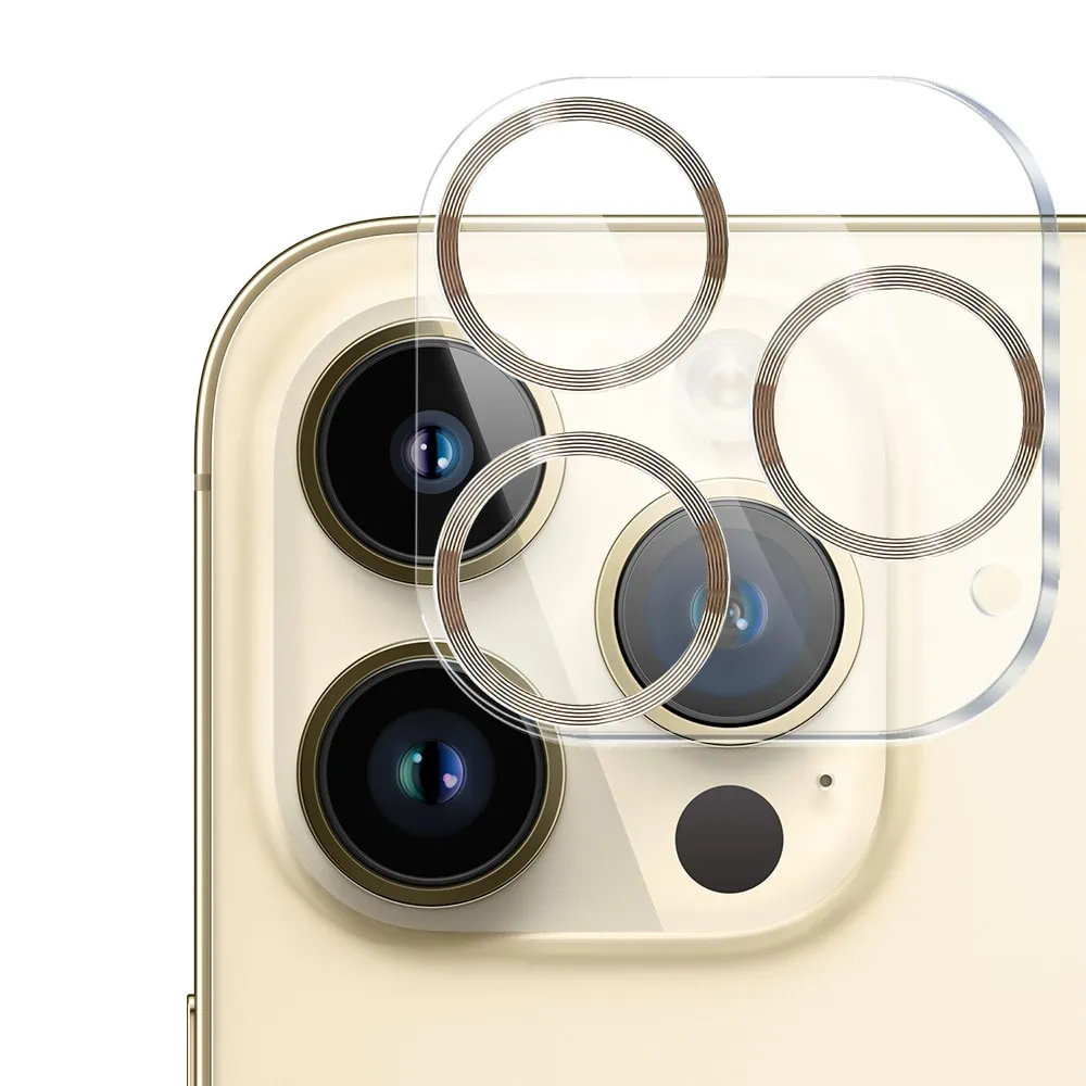 iPhone 16 Pro pełne szkło hartowane na cały aparat z metalowymi pierścieniami, złote