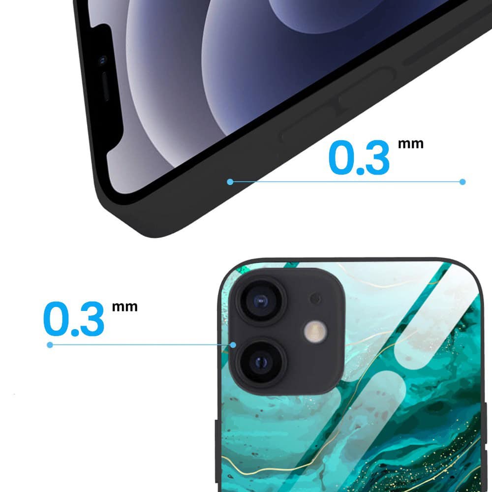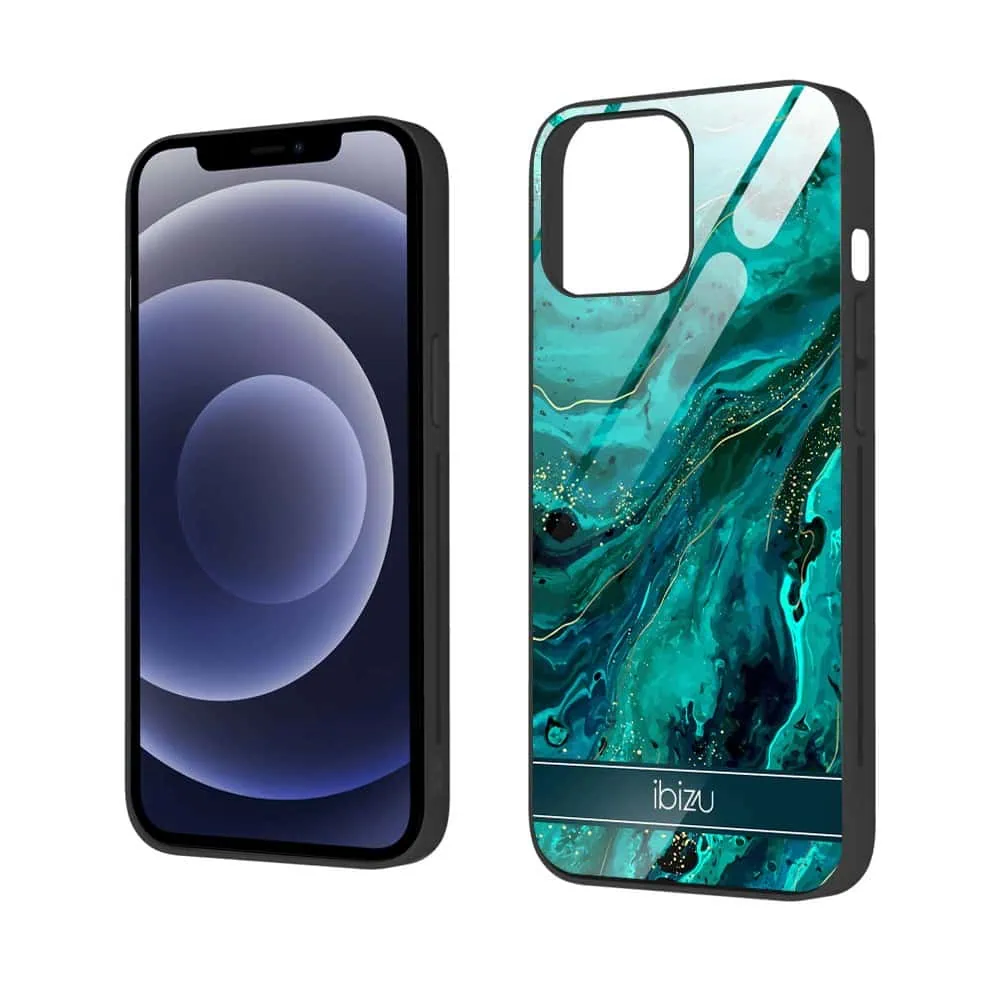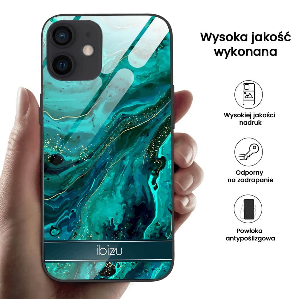 Etui do iPhone 12, Ibizu, szklany tył, zielony marmurek ze złoceniem, czarne
