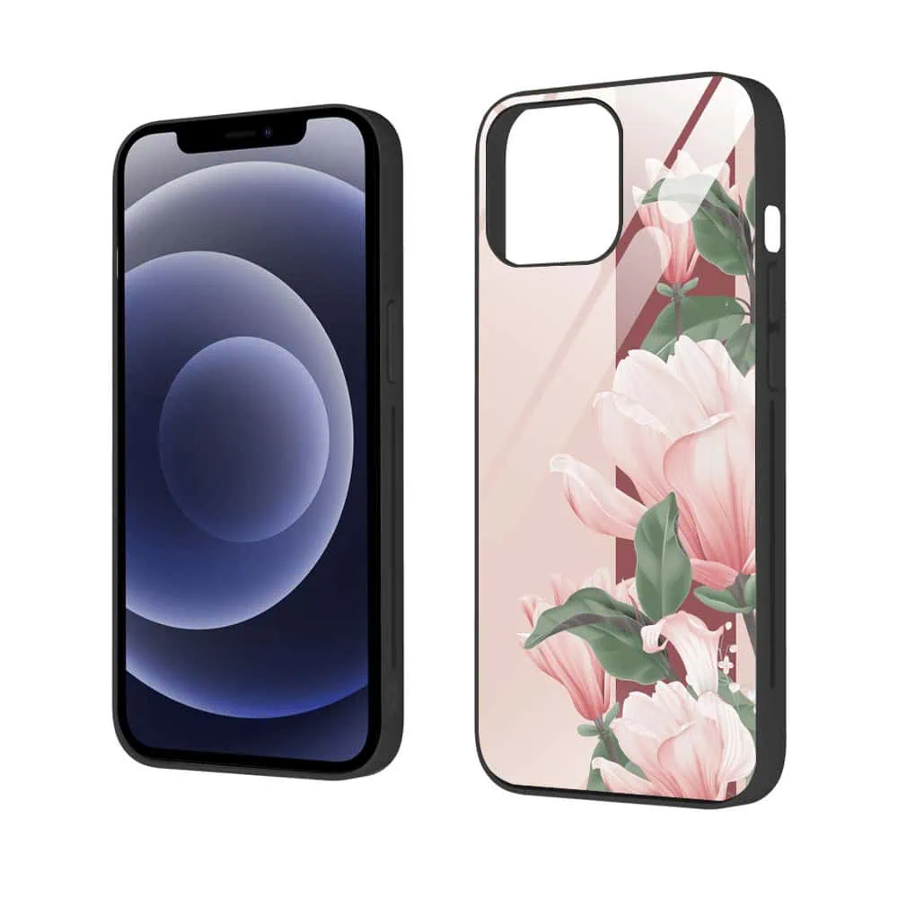 Etui do iPhone 12, szklany tył, subtelne róże, czarne