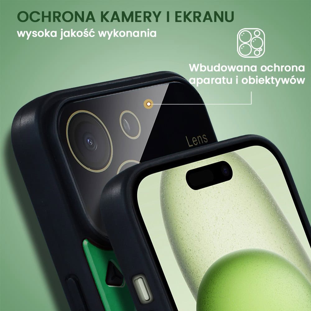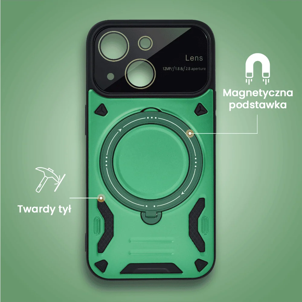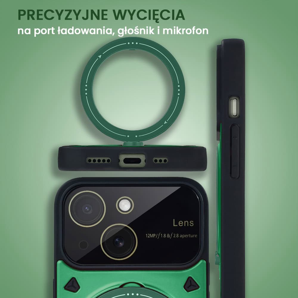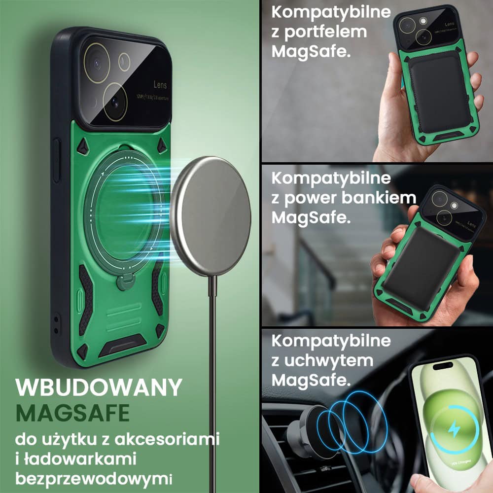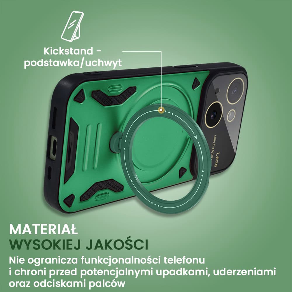 Etui do iPhone 15 Magsafe Camera Beam Stand pancerne, osłona kamery z podstawką, zielone