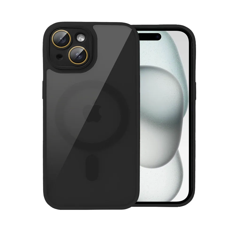 Etui do iPhone 15 Plus eleganckie, ze złotym, metalowym uchwytem i zdobieniami, osłona na aparat, czarne