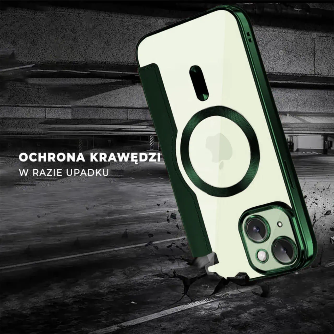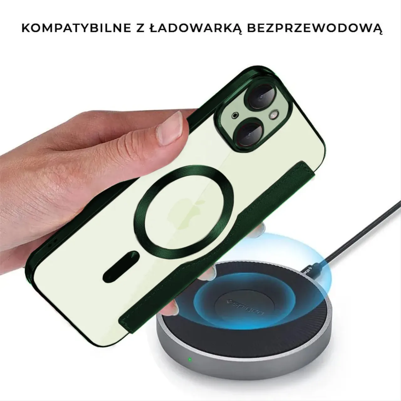 Etui do iPhone 15 Plus, typu książka Book Magsafe Lens Protect, z klapką, zielone