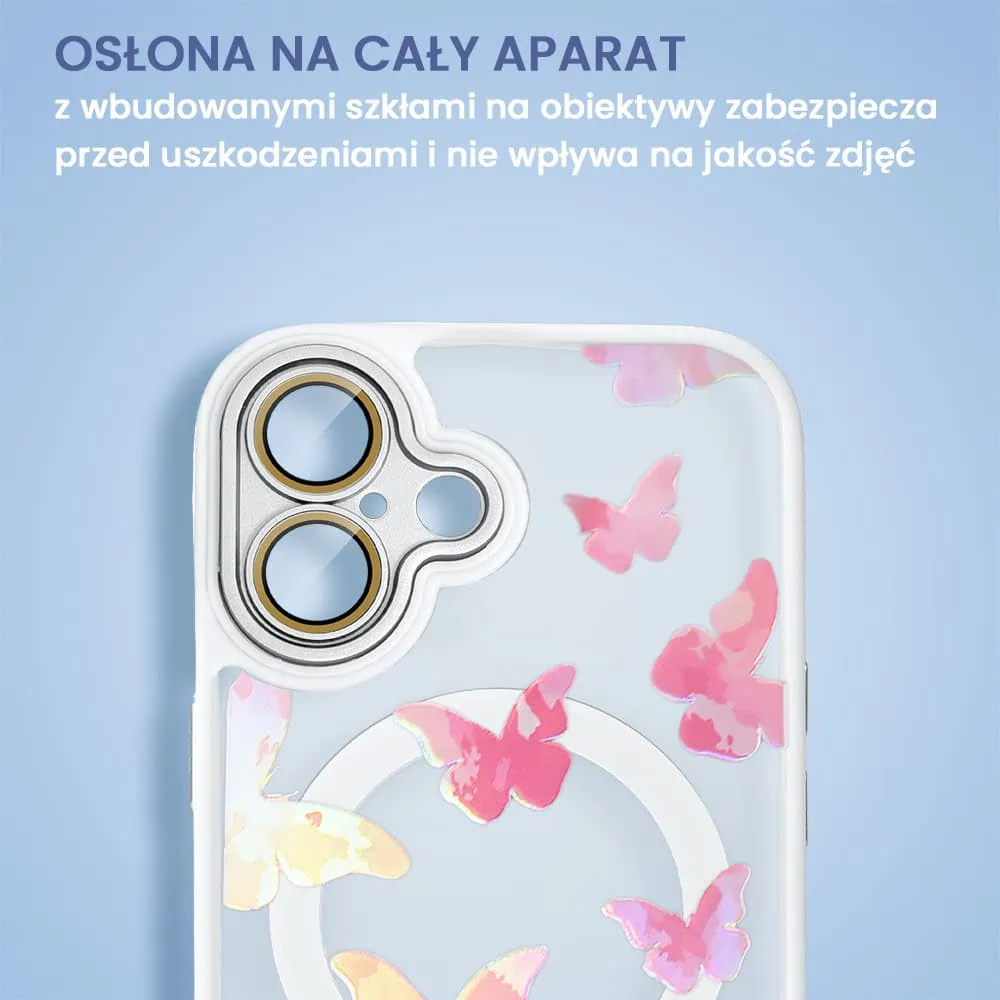 Etui do iPhone 16 Color Flush z Magsafe, z osłoną aparatu, z opalizującym nadrukiem motylki, białe