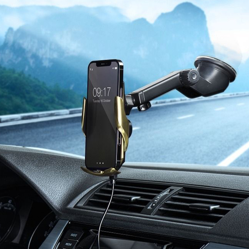 Uchwyt samochodowy z ładowaniem bezprzewodowym, automatyczne ramiona, do kratki wlotu, przedniej szyby, złoty