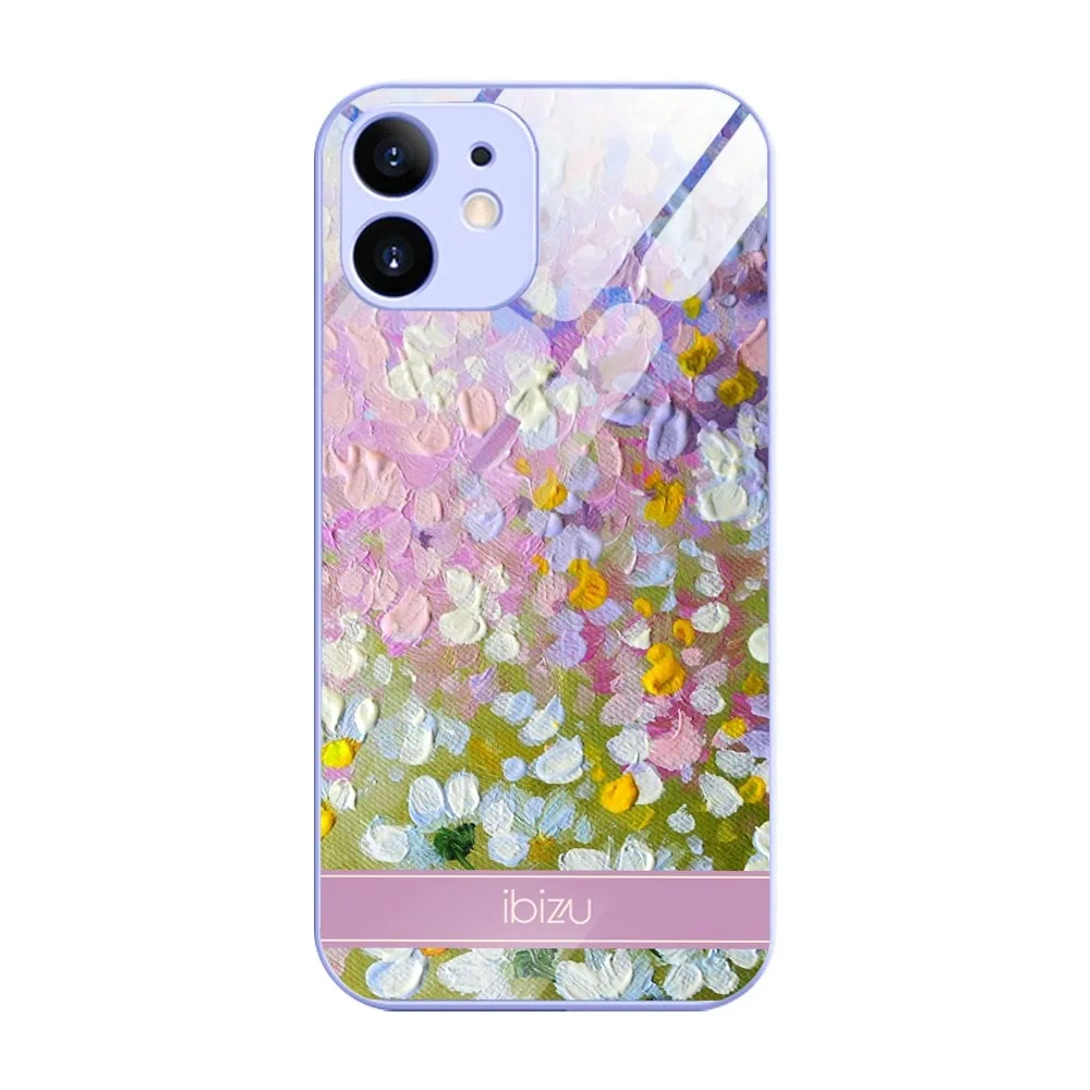 Etui do iPhone 12, Ibizu, szklany tył, osłona kamery, malowana łąka, fioletowe