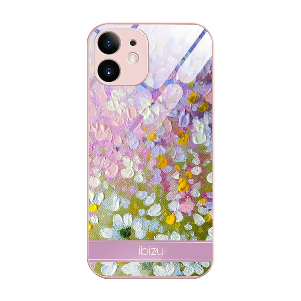Etui do iPhone 12, Ibizu, szklany tył, osłona kamery, malowana łąka, łososiowe
