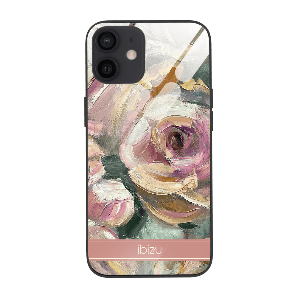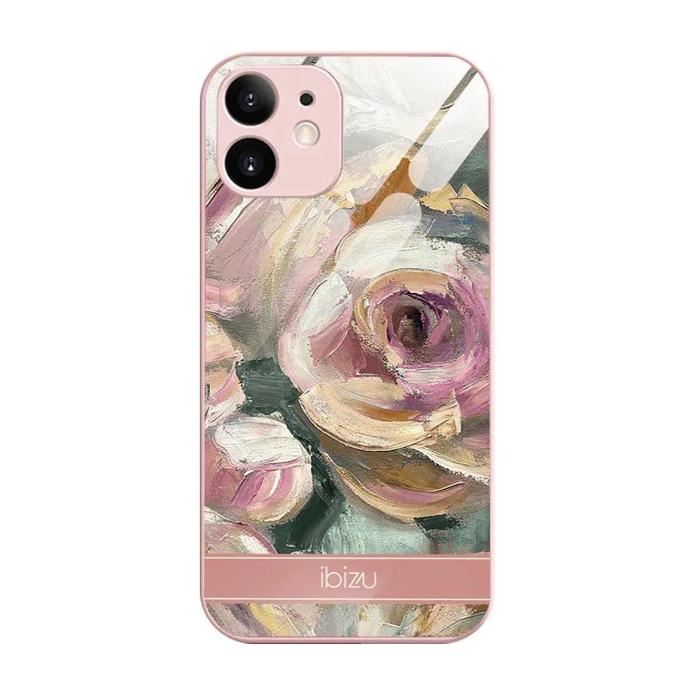 Etui do iPhone 12, Ibizu, szklany tył, osłona kamery, namalowane róże, łososiowe