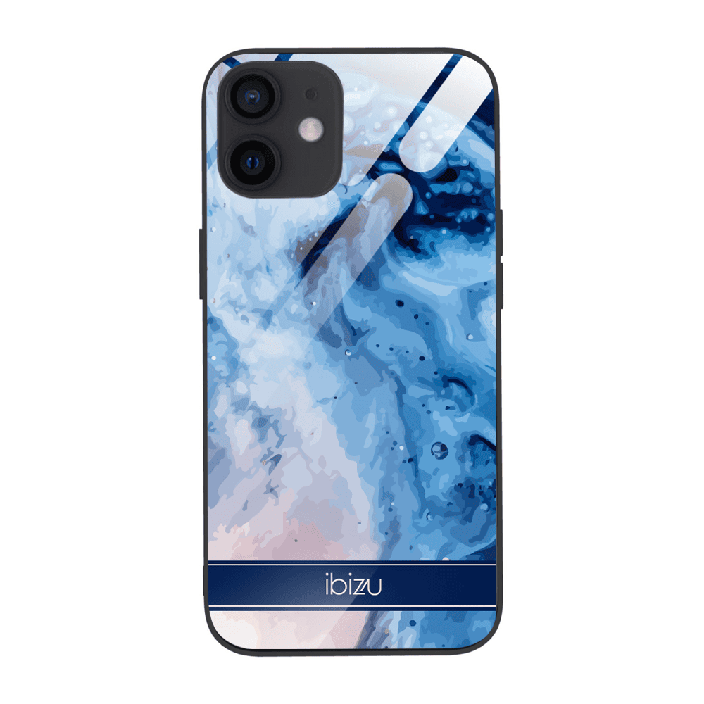 Etui do iPhone 12, Ibizu, szklany tył, błękitny marmurek wodny, czarne