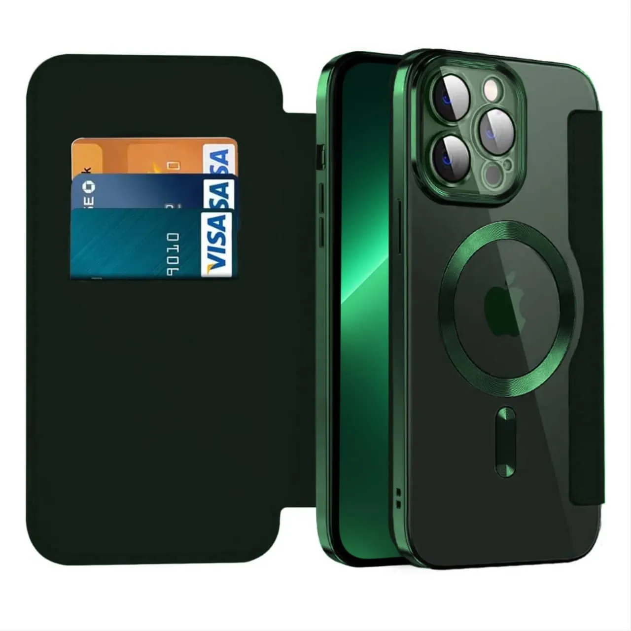 Etui do iPhone 13 Pro typu książka Book Magsafe Lens Protect, z klapką, zielone