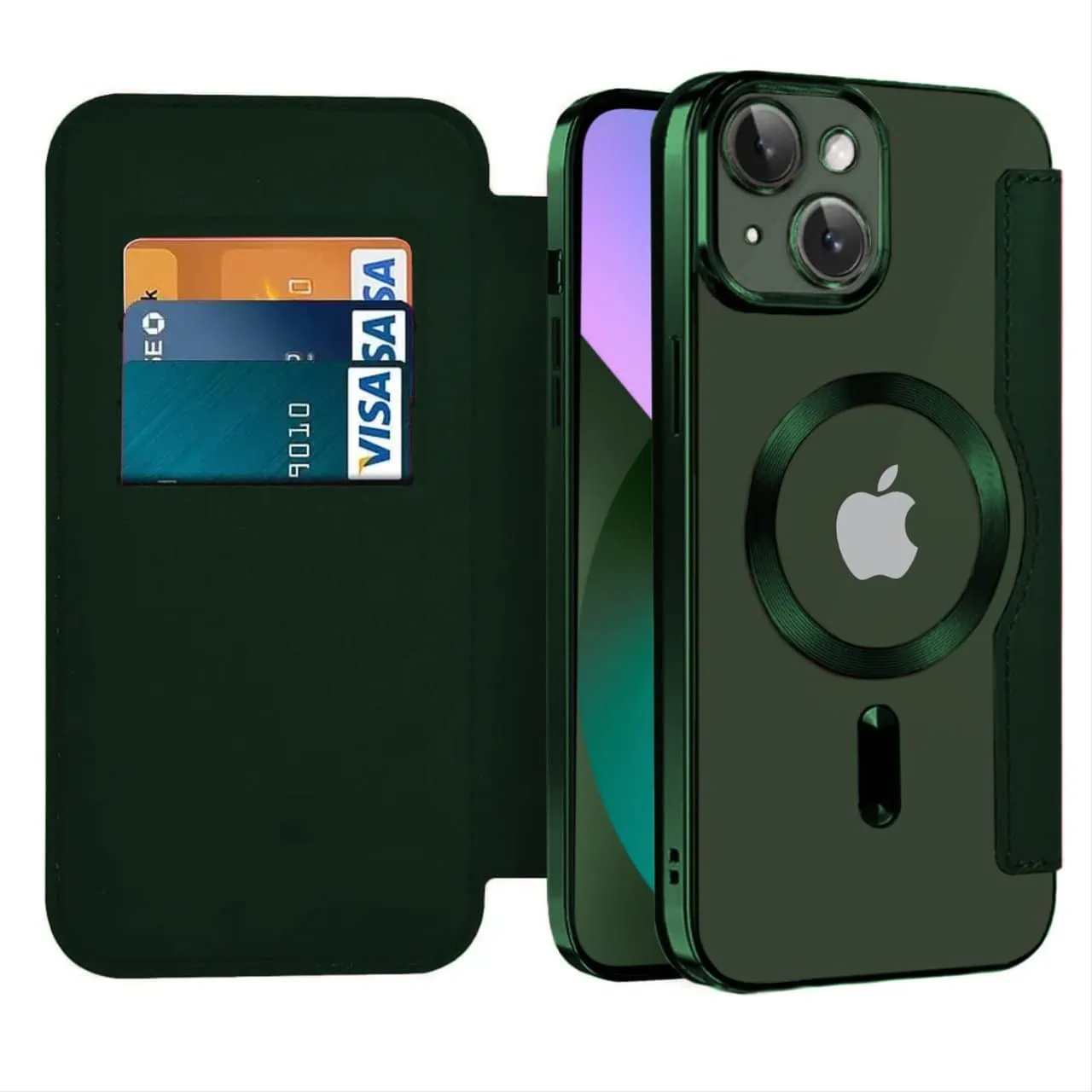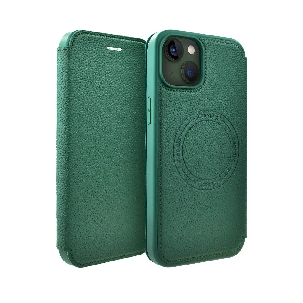 Etui do iPhone 13 eleganckie stylowe z magnetyczną klapką, ciemnozielone