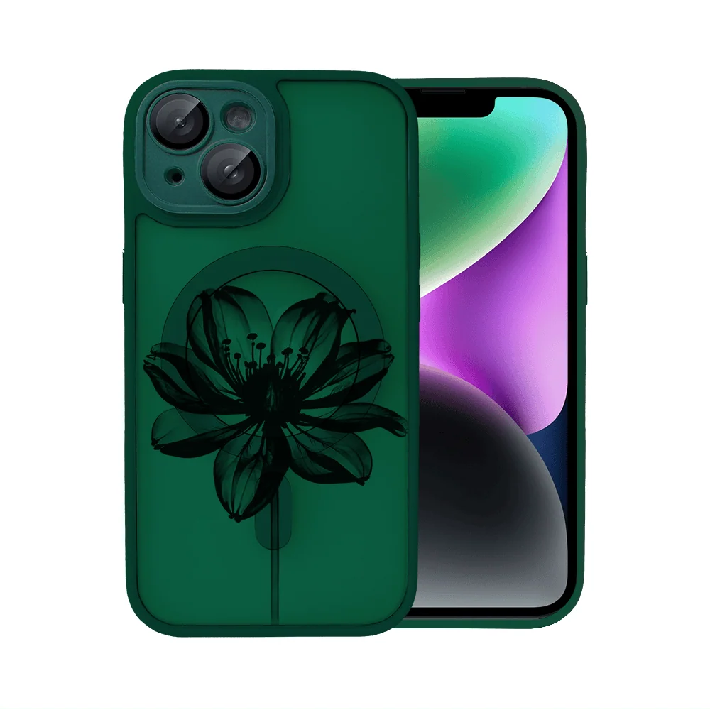 Etui do iPhone 14 Color Flush z Magsafe, z osłoną aparatu, z nadrukiem czarny kwiat, ciemna zieleń