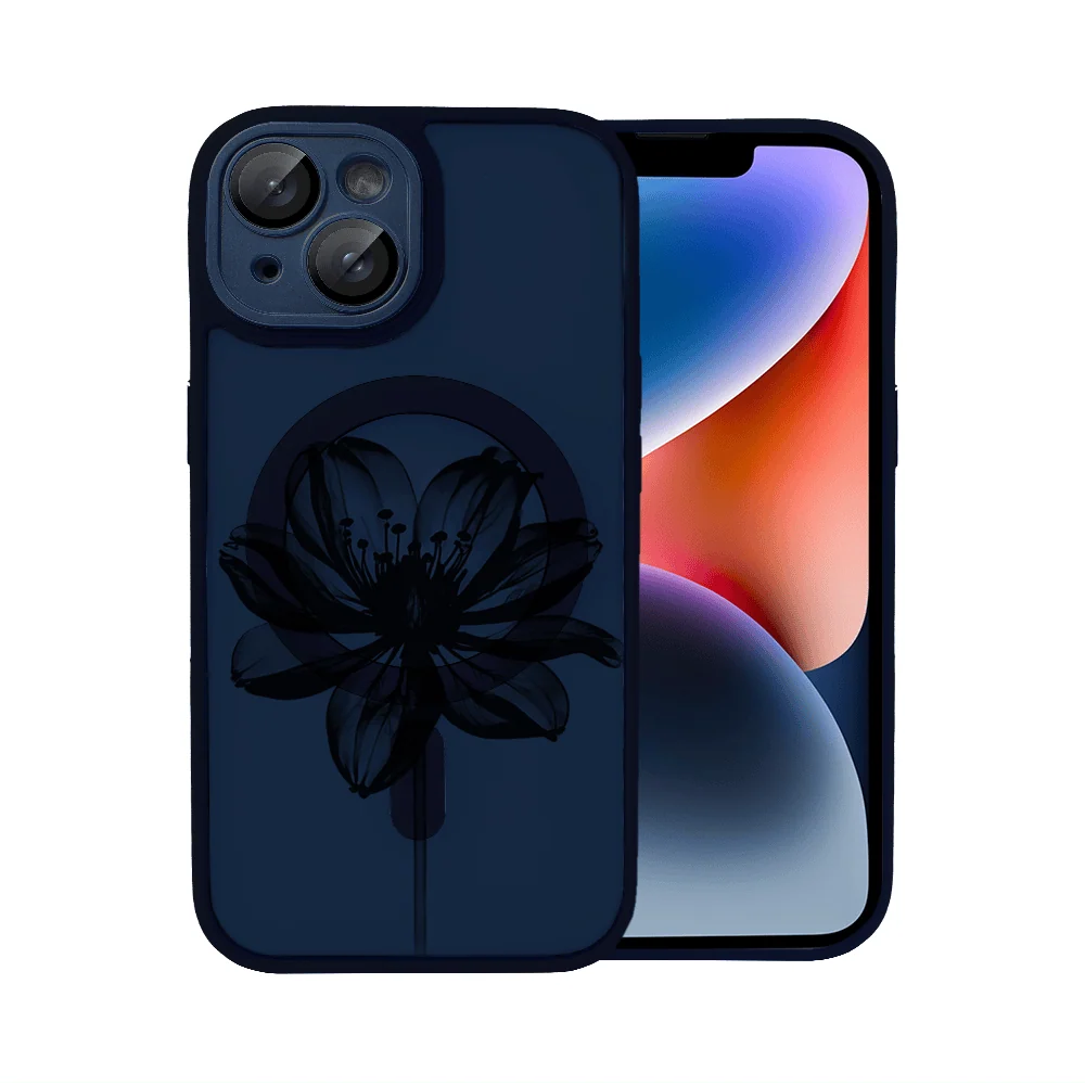 Etui do iPhone 14 Color Flush z Magsafe, z osłoną aparatu, z nadrukiem czarny kwiat, granatowe