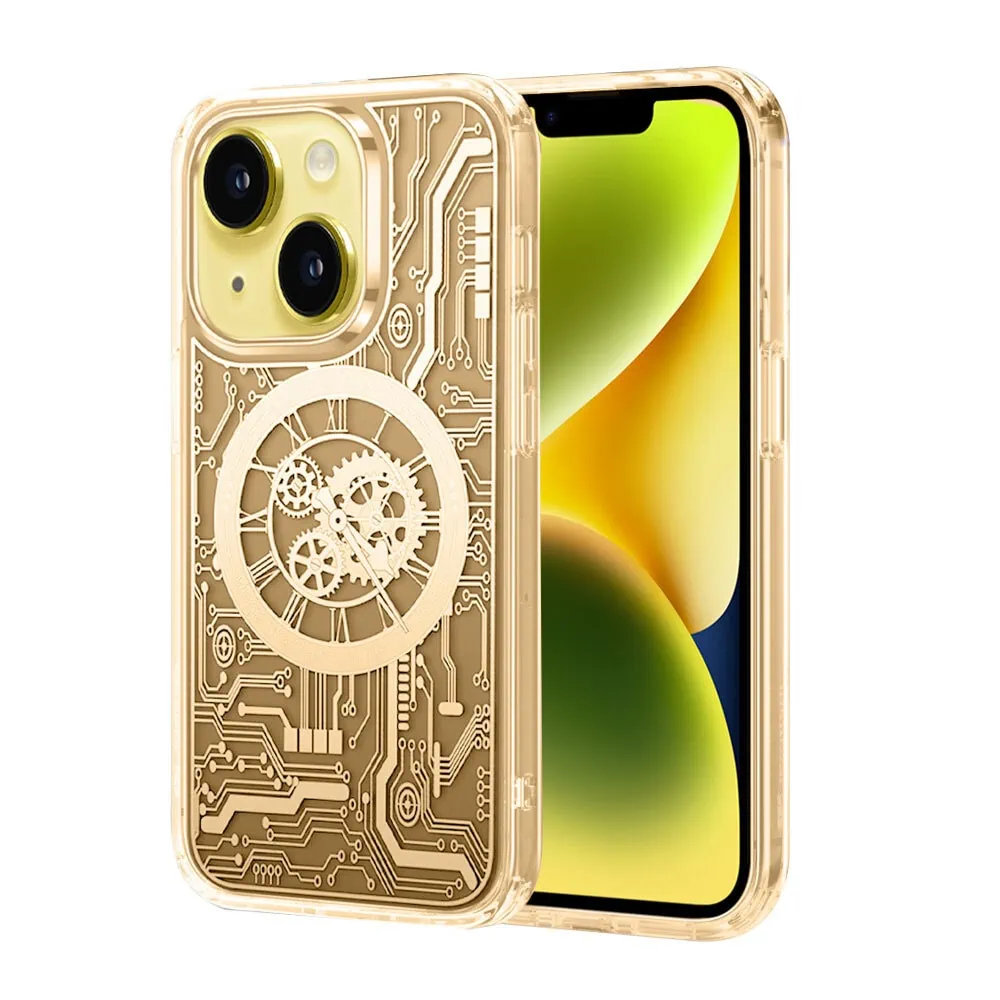 Etui do iPhone 14 ClockWork MagSafe, przeźroczyste z mechanizmem w środku, złote