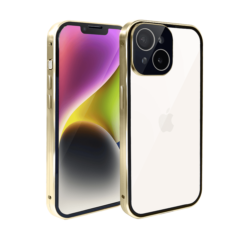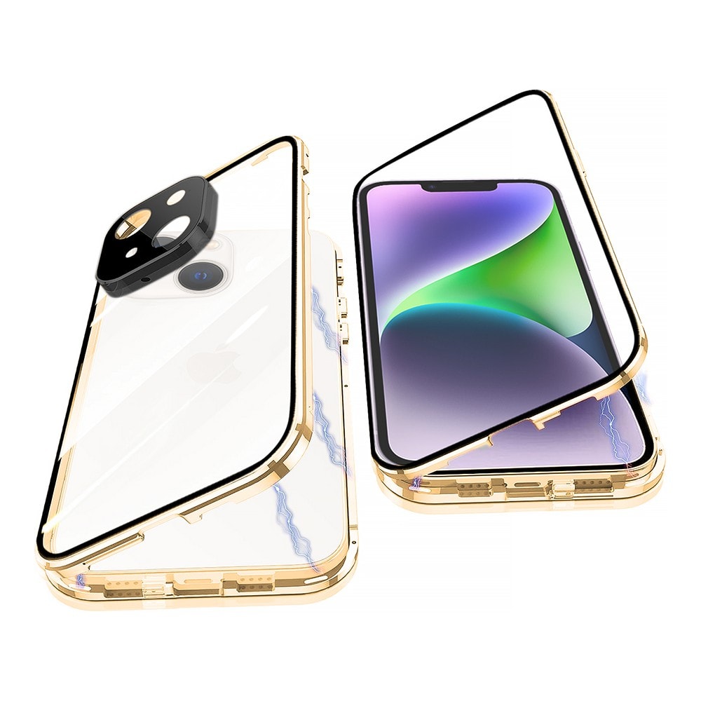 Obudowa do iPhone 14, podwójna szyba i polerowane aluminium 360° magnetyczna, z osłoną aparatu, złota