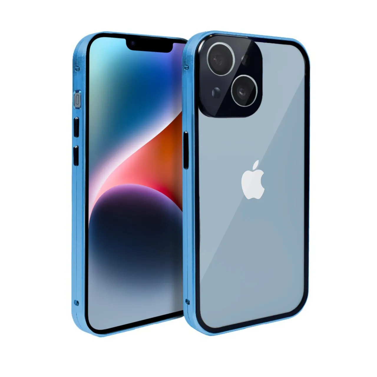 Obudowa do iPhone 14, podwójna szyba i aluminium 360° przód + tył magnetyczna, z osłoną aparatu, niebieska