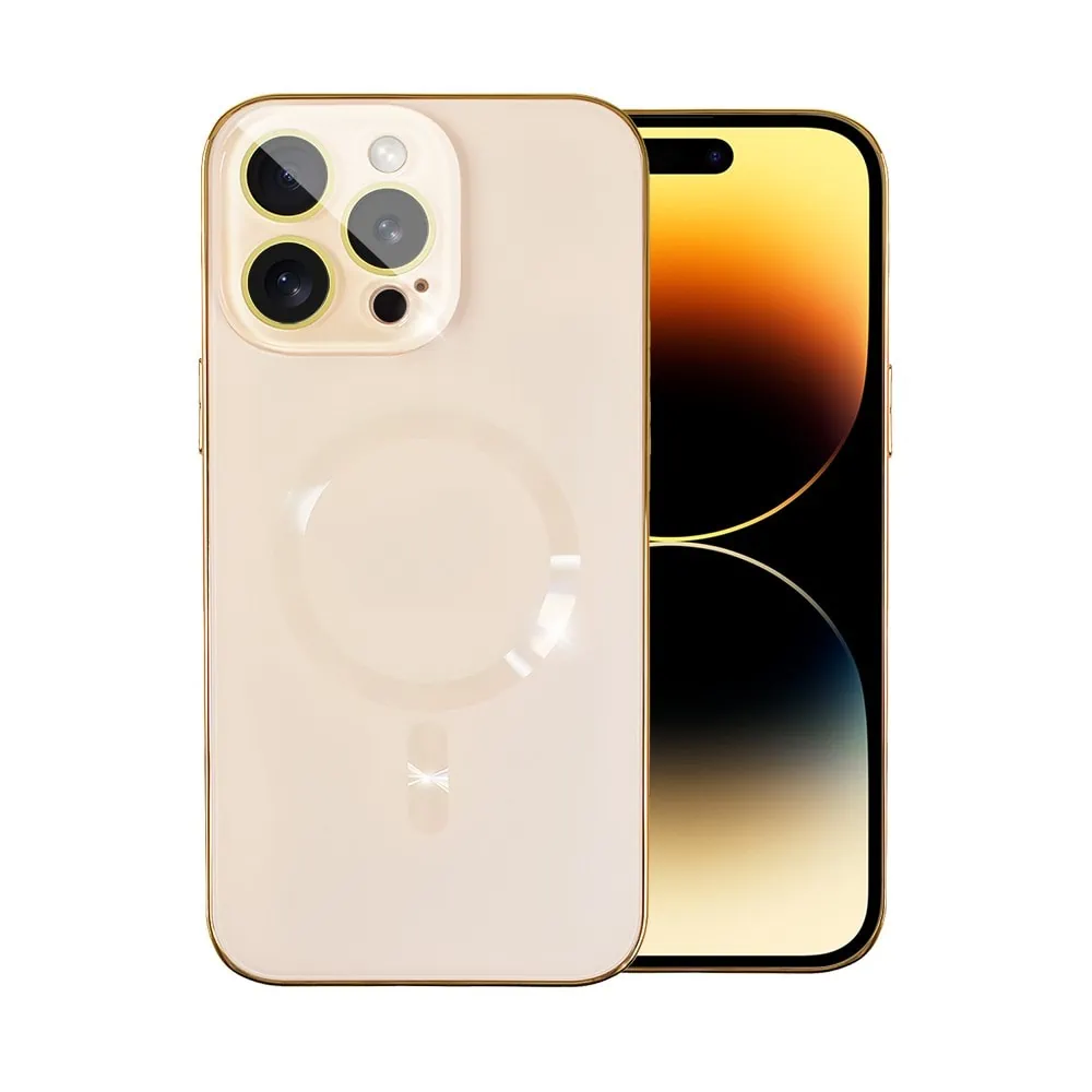 Etui do iPhone 14 Pro Max Ibizu Elite Skin, krystalicznie czyste z metalową ramką, złote z MagSafe