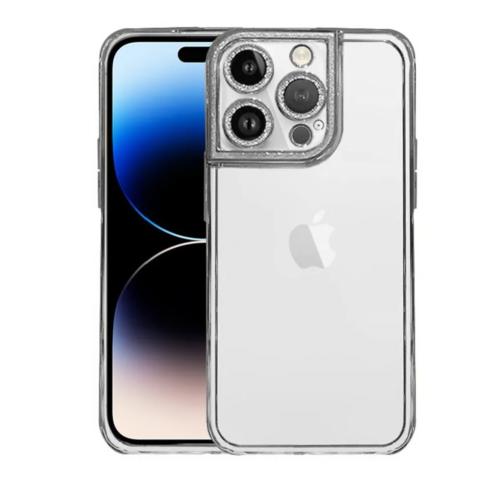 Etui do iPhone 14 Pro Max kryształowa struktura, osłona na aparat, przeźroczyste ze srebrną ramką