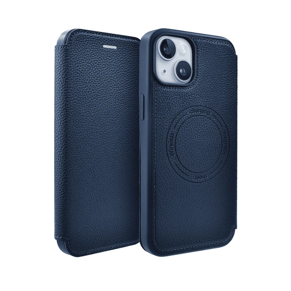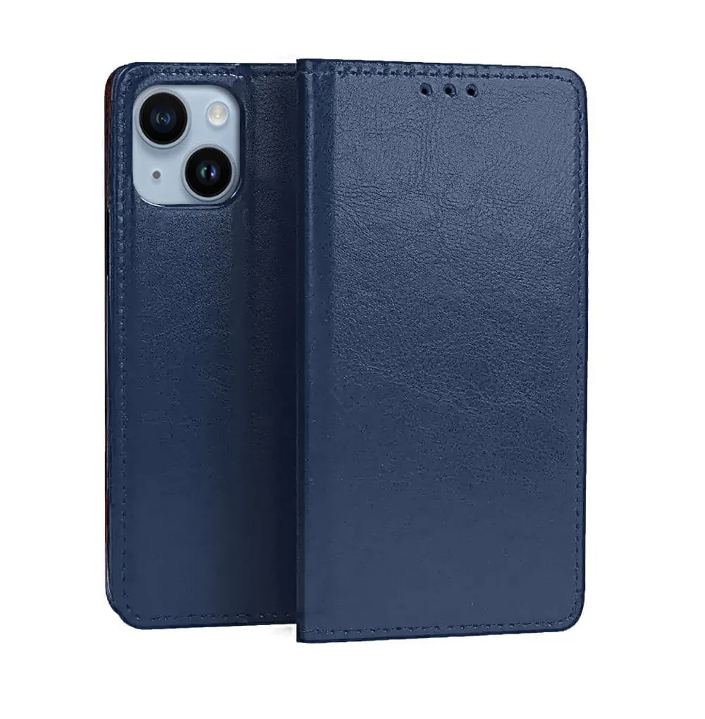 Etui do iPhone 14 zamykane, eleganckie skórzane, granatowe