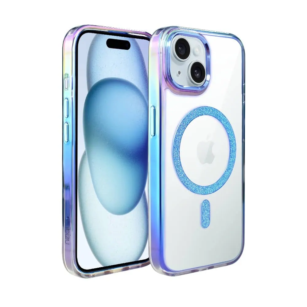 Etui do iPhone 15 Glitter Crown, opalizujące, przeźroczyste z brokatowym MagSafe, niebieskie