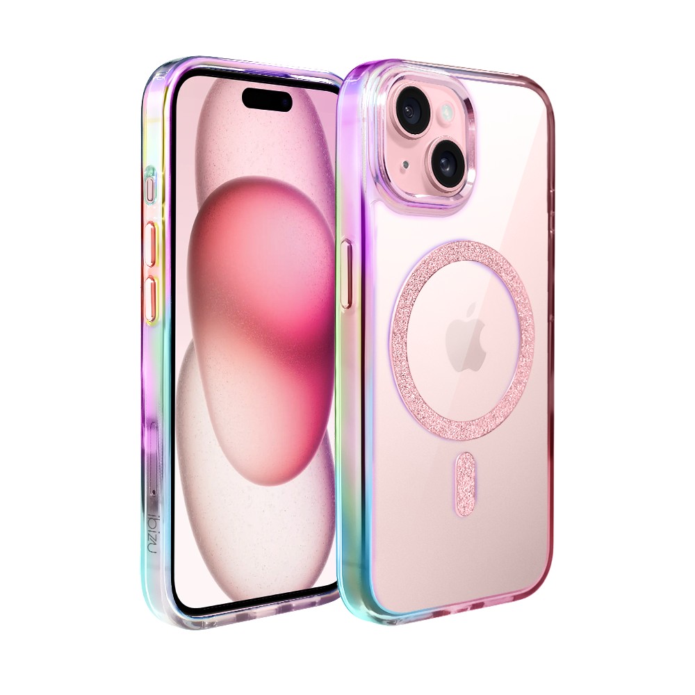 Etui do iPhone 15 Glitter Crown, opalizujące, przeźroczyste z brokatowym MagSafe, różowe