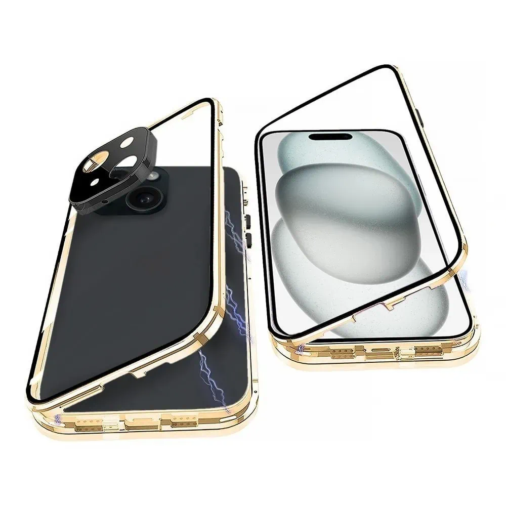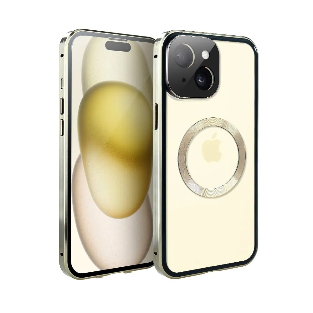 Obudowa do iPhone 15, podwójna szyba i polerowane aluminium 360° magnetyczna, z osłoną aparatu, złota