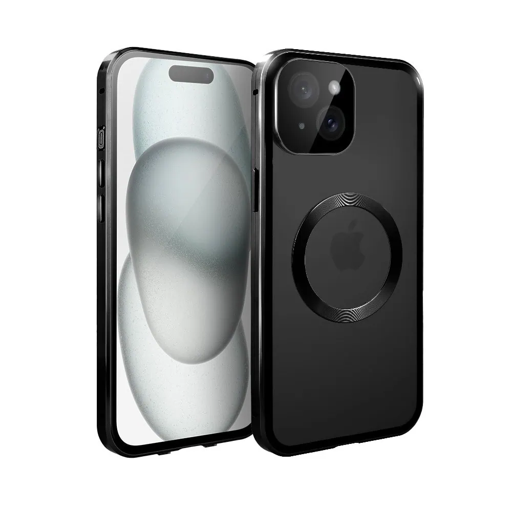 Obudowa do iPhone 15 podwójna szyba i aluminium 360° przód + tył magnetyczna, matowy tył, z MagSafe i osłoną aparatu, czarna