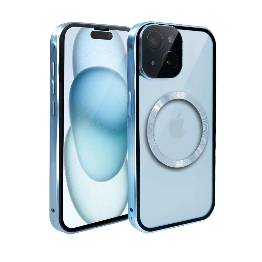 Obudowa do iPhone 15 podwójna szyba i aluminium 360° przód + tył magnetyczna, z osłoną aparatu, niebieska