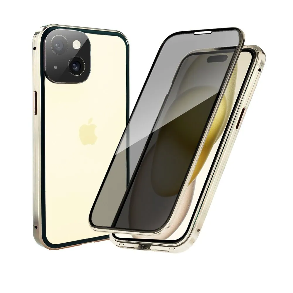 Obudowa do iPhone 15, podwójna szyba i aluminium 360° przód + tył magnetyczna, z osłoną aparatu i szkłem prywatyzującym, złota