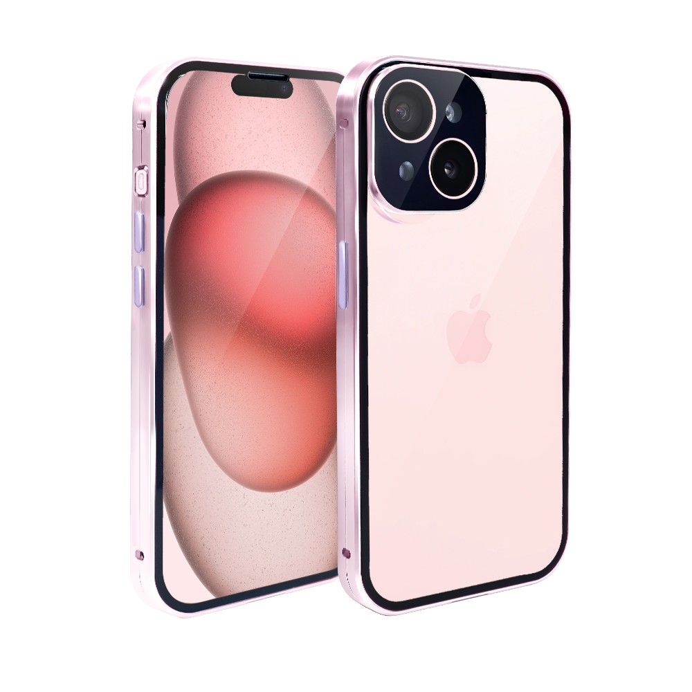 Obudowa do iPhone 15, podwójna szyba i aluminium 360° przód + tył magnetyczna, z osłoną aparatu, blady różowy