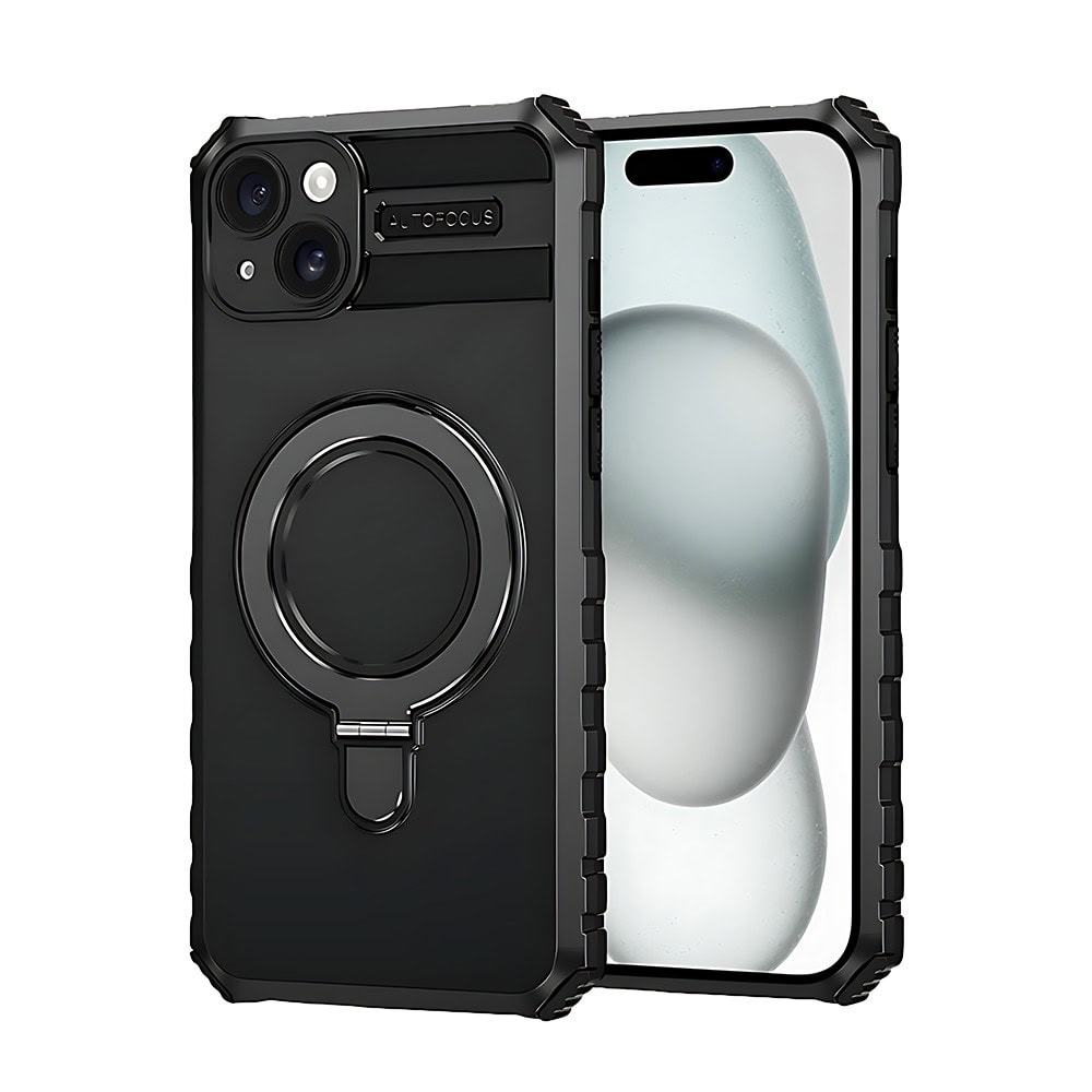 Etui do iPhone 15, pancerne, z osłoną aparatu i metalową podstawką MagSafe, czarne