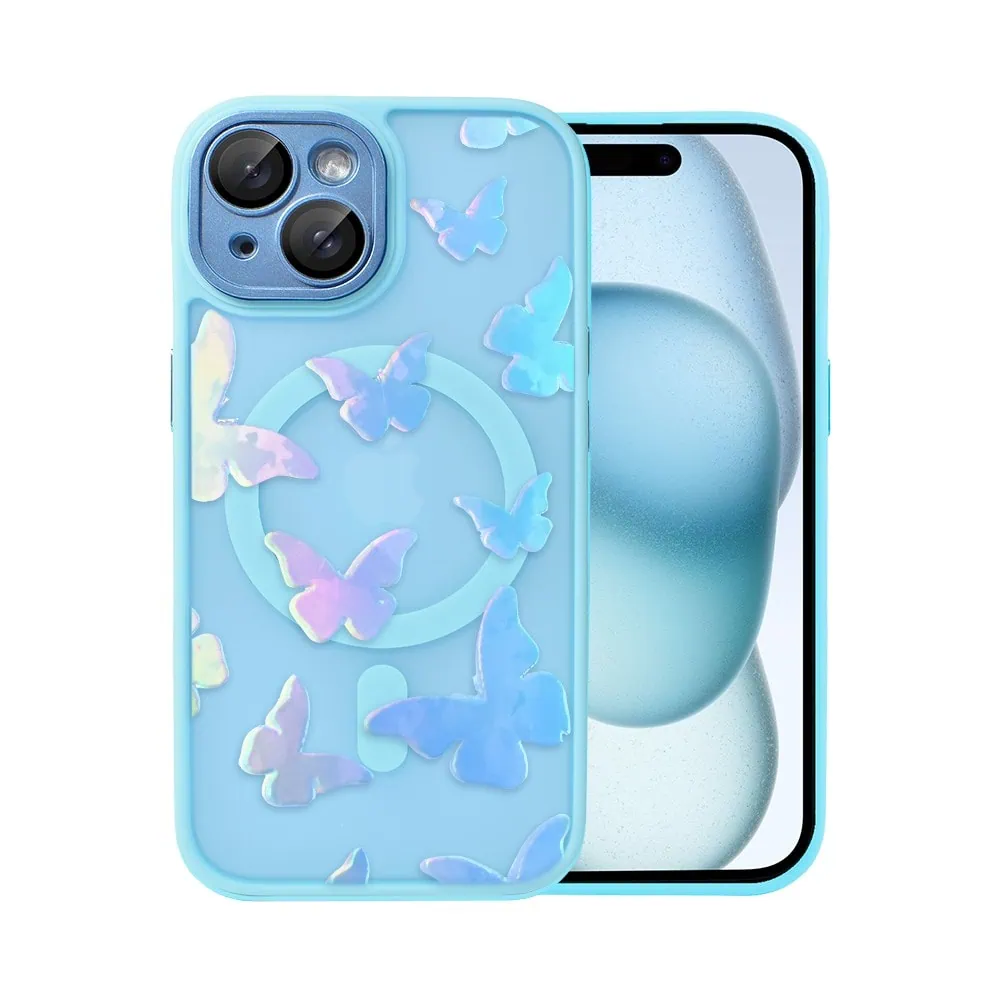 Etui do iPhone 15 Plus Color Flush z Magsafe, z osłoną aparatu, z opalizującym nadrukiem motylki, niebieskie