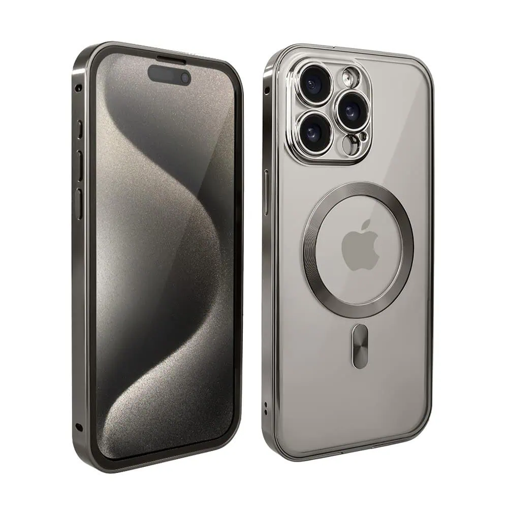 Obudowa do iPhone 15 Pro, podwójna szyba i polerowane aluminium 360° zamykany przód + tył z MagSafe, tytanowa