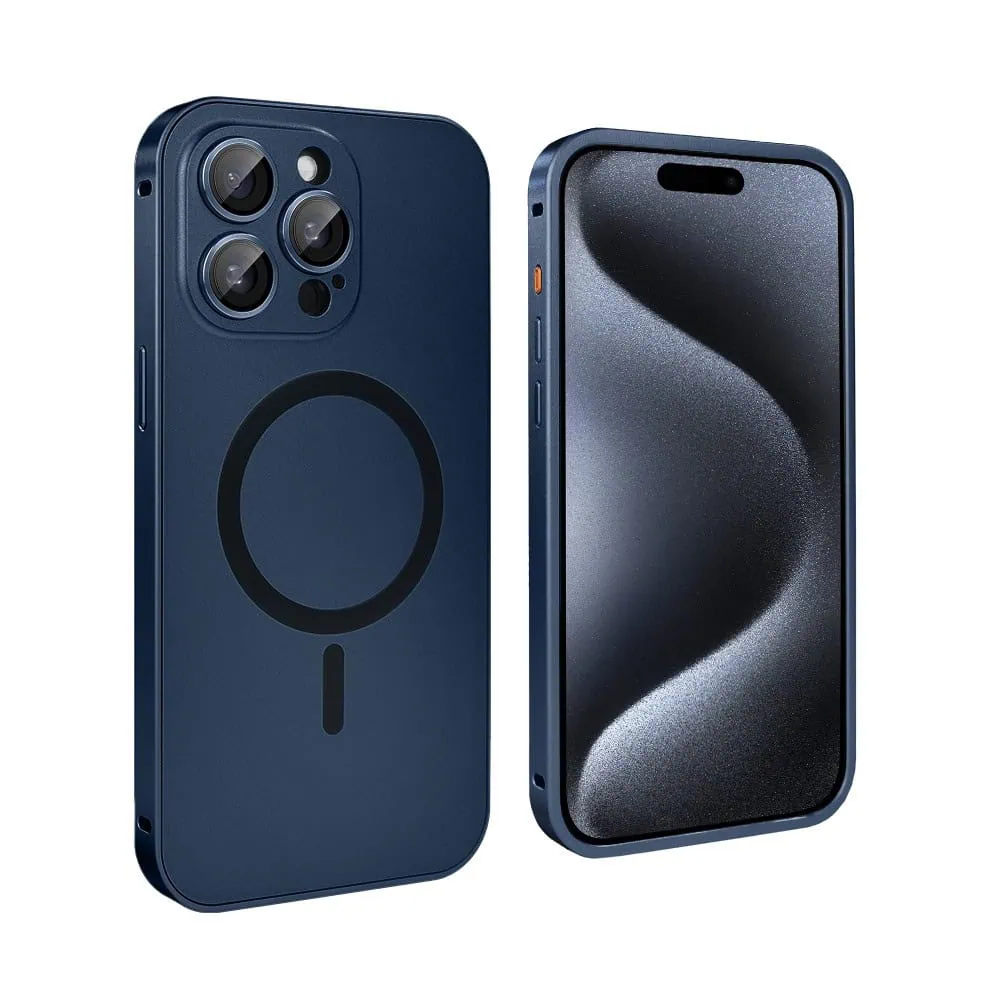 Etui do iPhone 15 Pro Max Metal Solid Magsafe, pełny tył z metalową ramką i osłoną aparatu, granatowe
