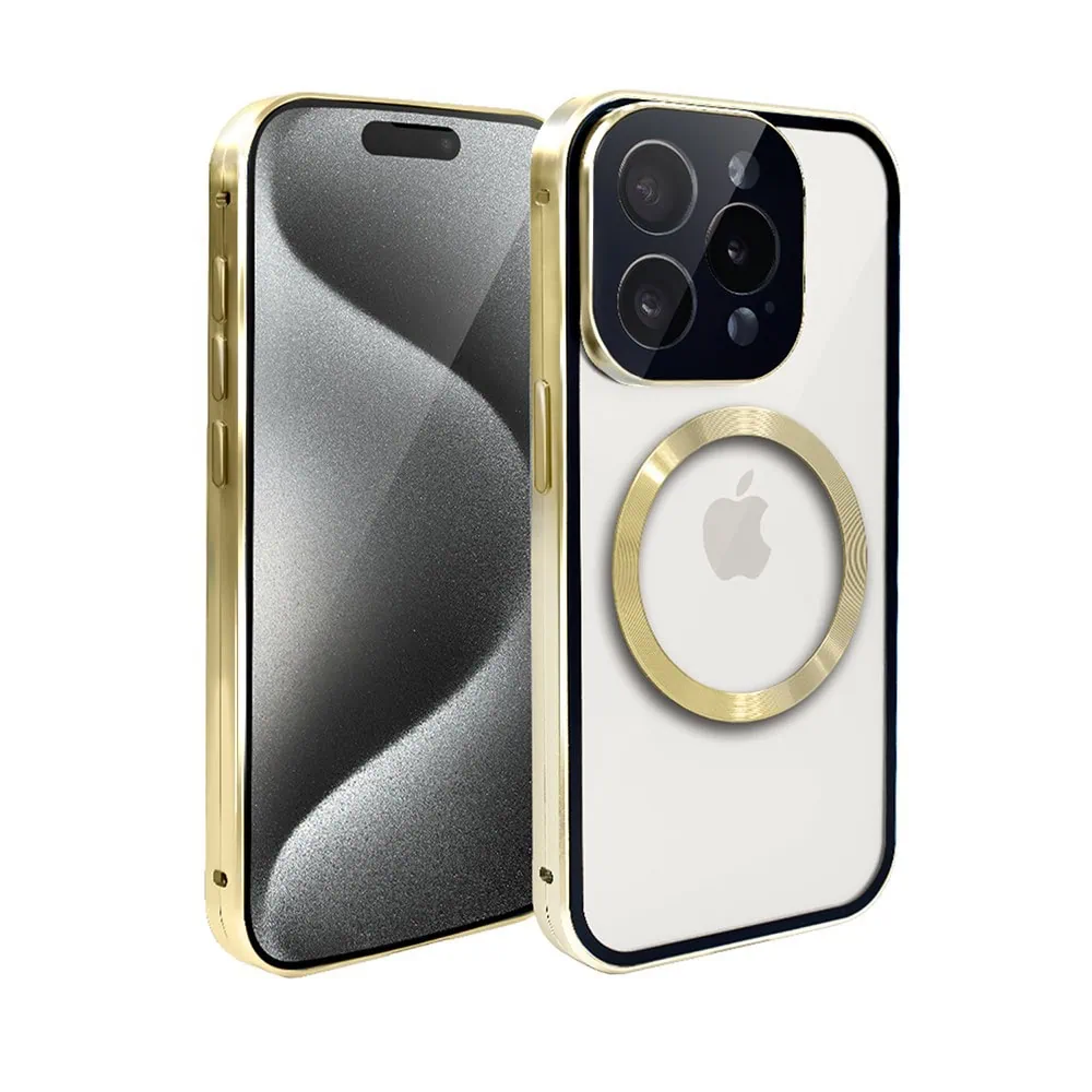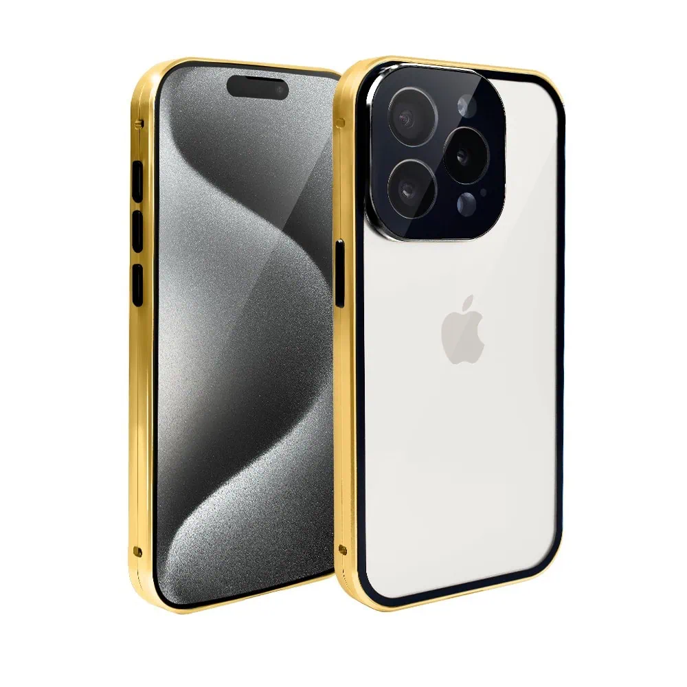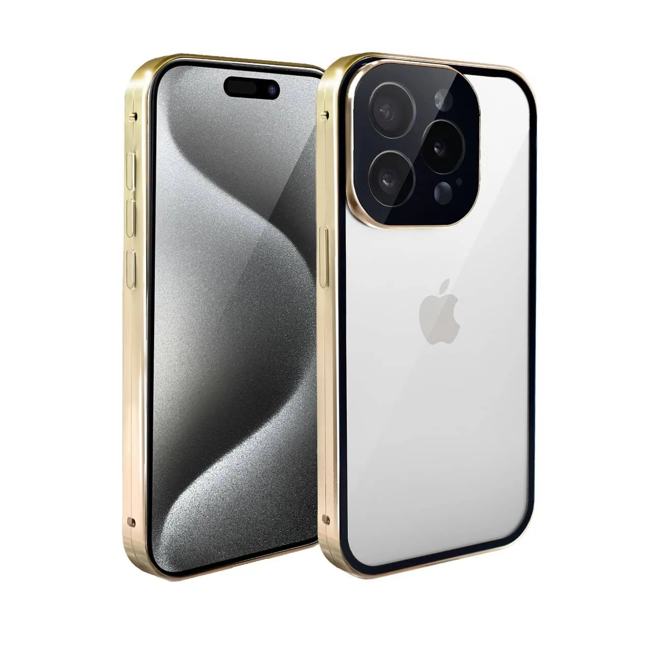 Obudowa do iPhone 15 Pro Max podwójna szyba i polerowane aluminium 360° magnetyczna, z osłoną aparatu, złota