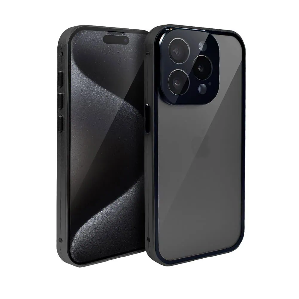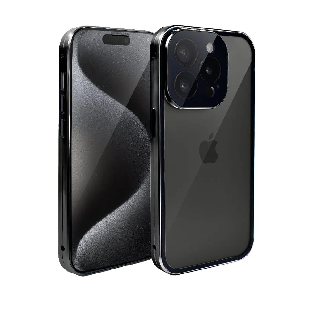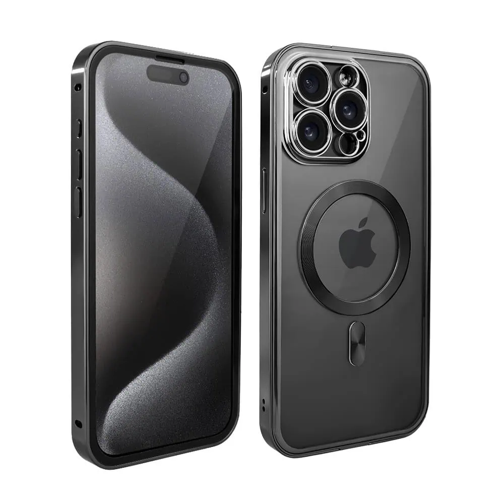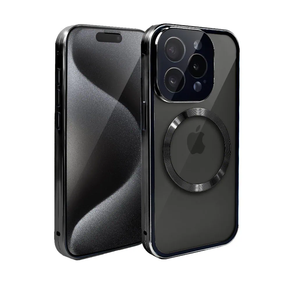 Obudowa do iPhone 15 Pro Max podwójna szyba i polerowane aluminium 360° magnetyczna, z osłoną aparatu, czarna